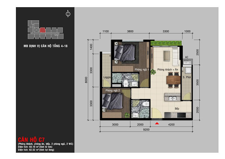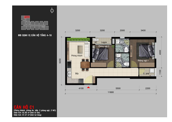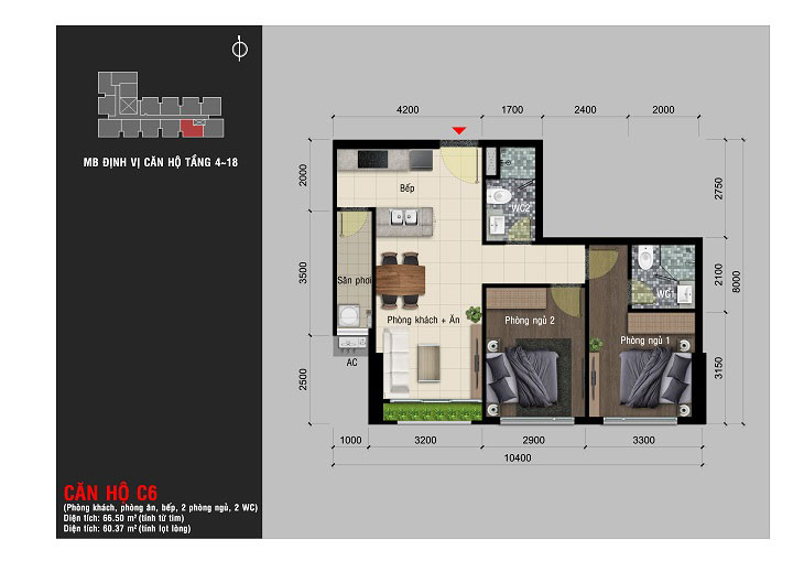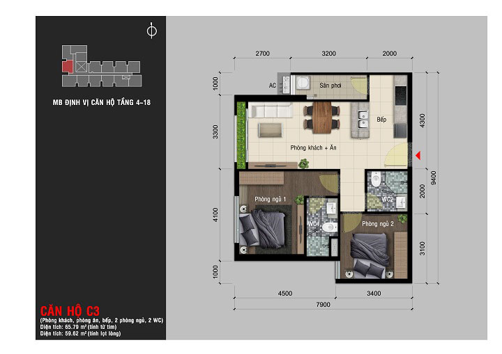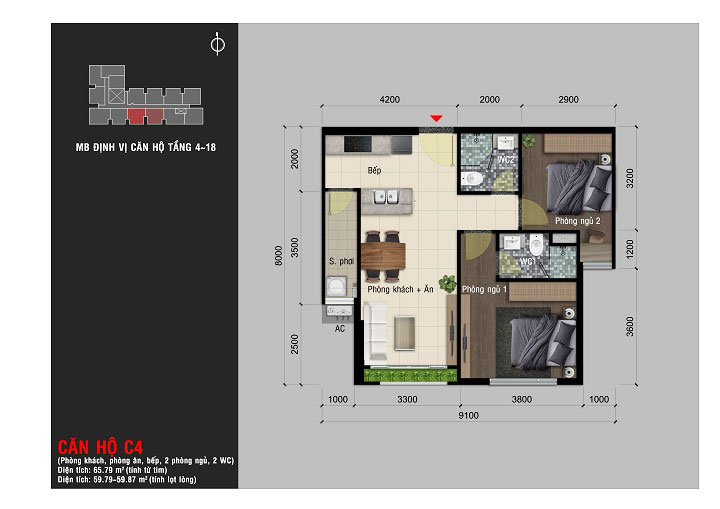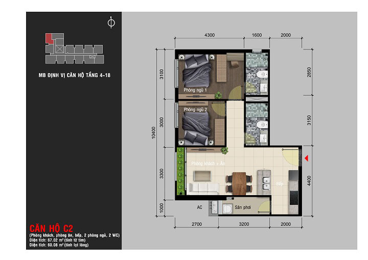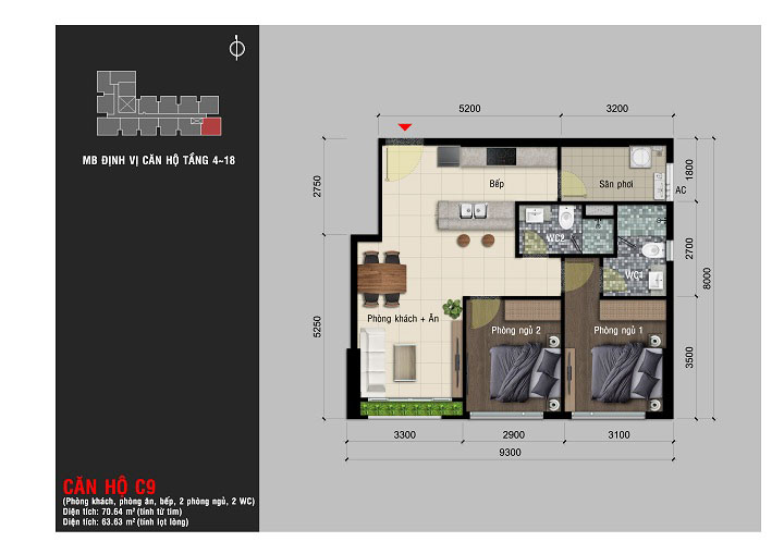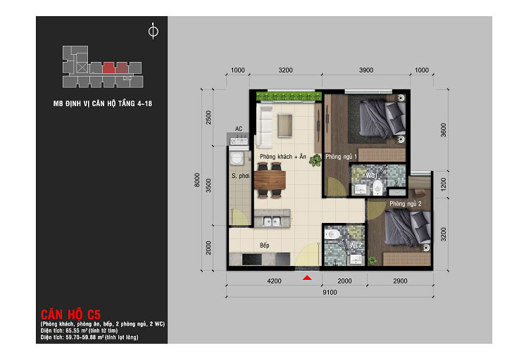 - 2PN-2WC: Diện tích 63,96 m2 đến 70,64 m2